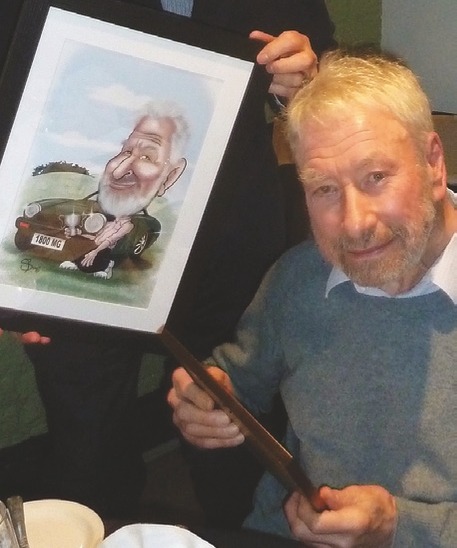 The photograph is of Danny Waters, our technical guru for many years. He is collecting the Marque of Friendship Award from Club Director, George Wilder, and the caricature as a thank you from the MGB Register.