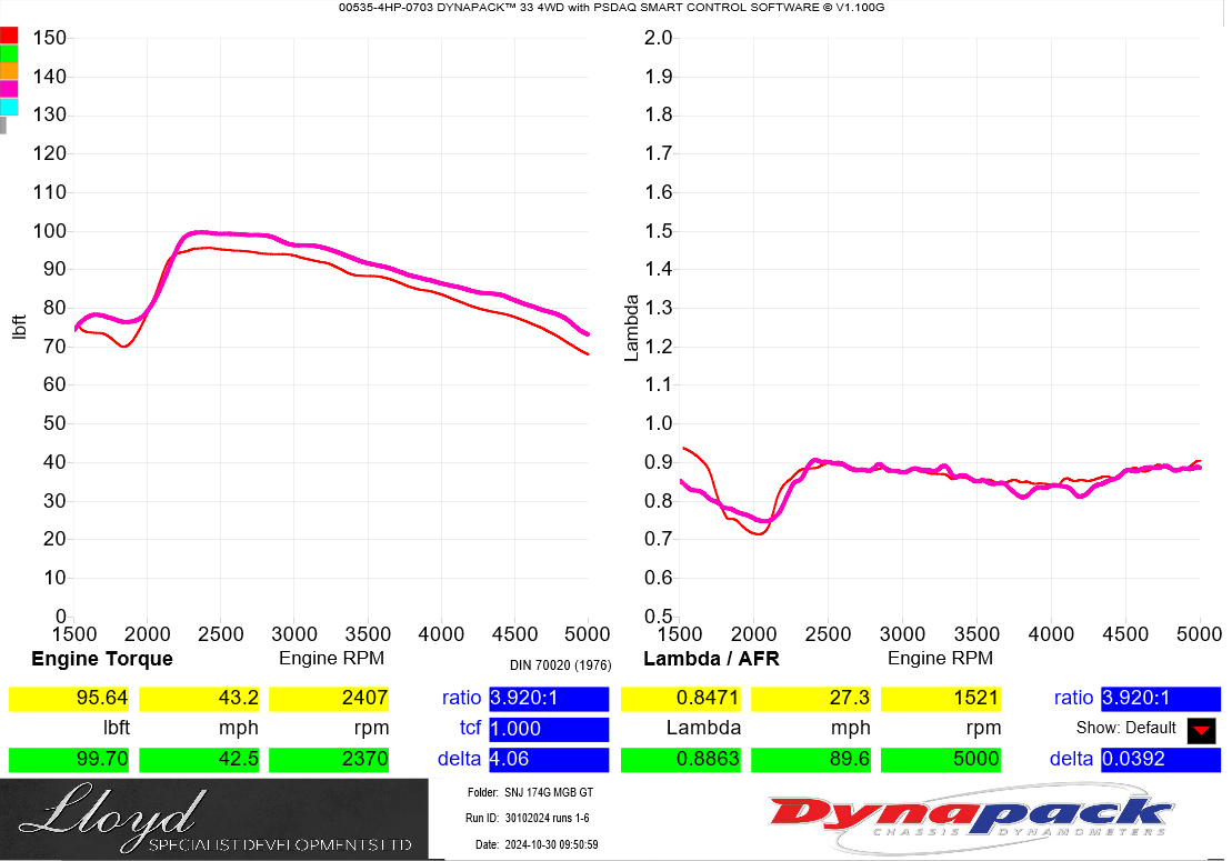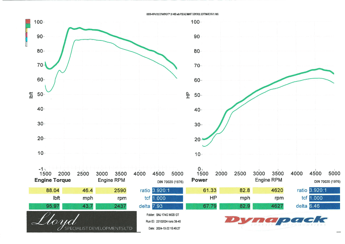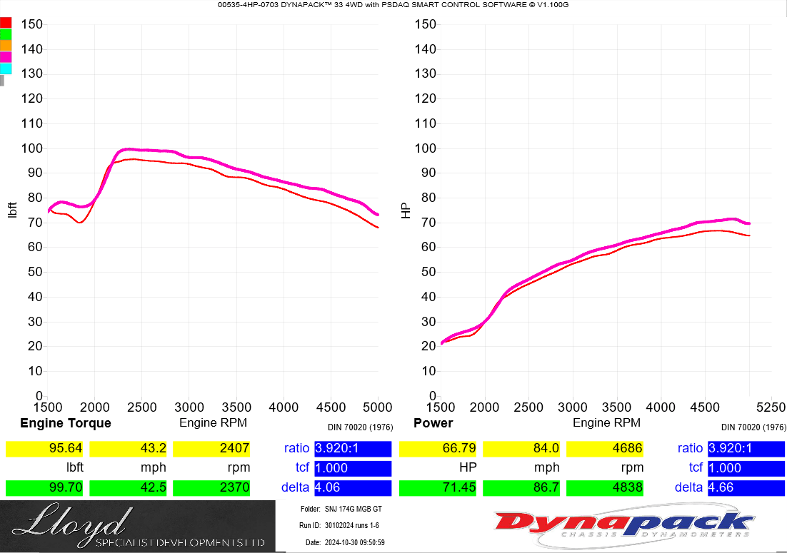 45 power runs, 7 hours and 4 tea rounds later and the engine performance had improved significantly from the baseline results. Other than a significantly better fuelling profile across the rev range, all important engine torque had risen by 9%, from 88.04 to 95.97 lb.ft. Power at the hub had increased from 61.33 to 67.79 bhp, a respectable 10.5% uplift.