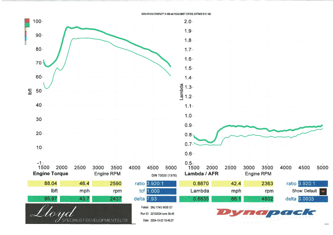 With fuelling achieving an acceptable profile attention turned to timing. As expected, the advance was found to be 10degrees, but I had some old notes on file showing that tuning 10 years previous had found 13degrees to be optimum. Sure enough, this adjustment produced a positive result and we were closing in on a good set up. The Ignition123 profile was checked and confirmed to be the MGB stage-2 curve, but Nathan felt that an alternative curve with 26degree advance at 5,000rpm was worth a try. Sure enough, this resulted in the final and significant uplift in performance for the day.