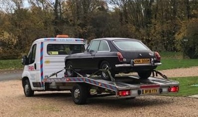 I hoped to be able to drive the car the 25 miles home but due to some serious carburettor fuel leaks, seized front brakes and flat tyres, it had to be trailered to my garage at home.