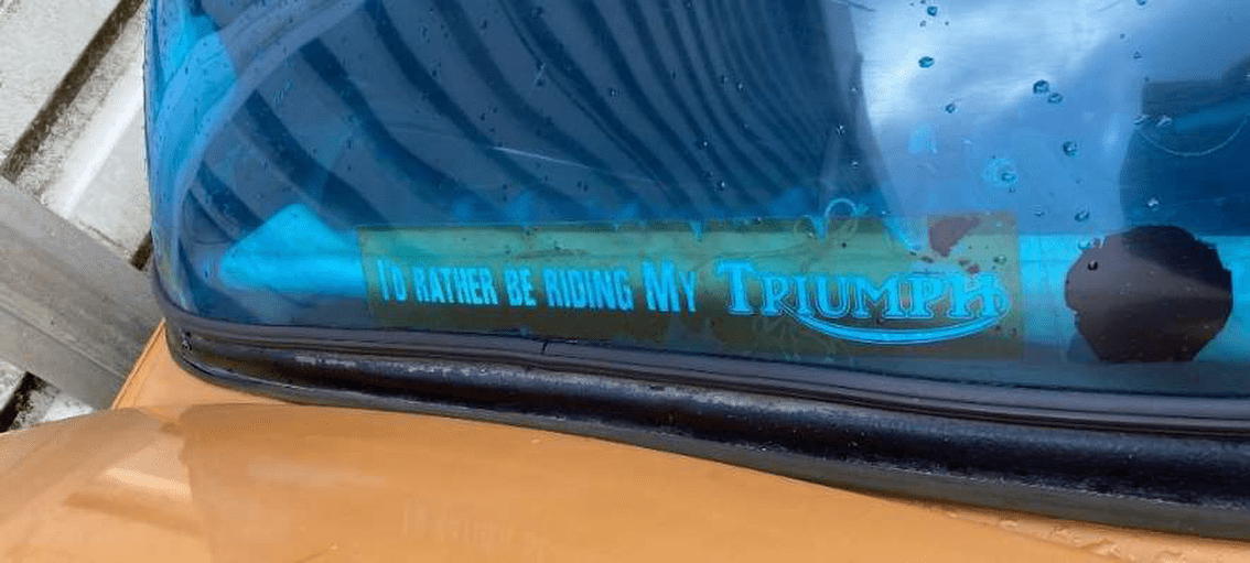 On the hard top rear window, is a stickergoing across the base of the window: ‘I would rather be riding my Triumph’. Dad being an avid Vintage Triumph man!