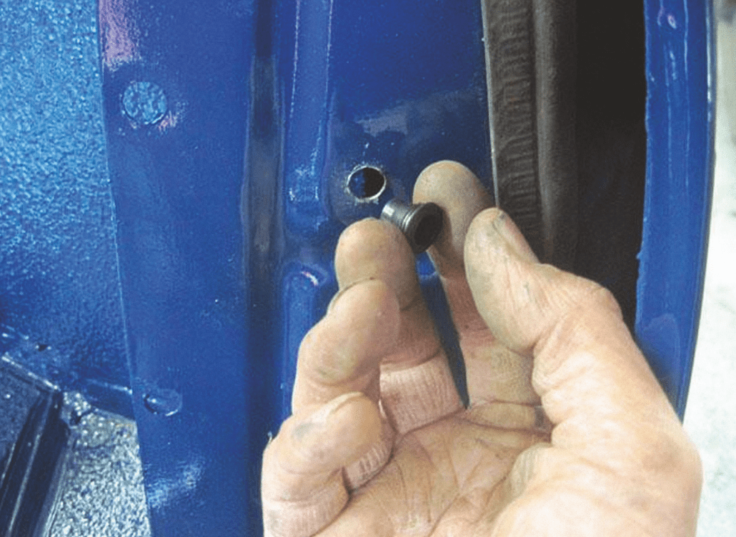 The doors are next on the list for treatment. If you have removed the trims then you can use the spray nozzle. If not, then you will still need the probe to inject through the drilling in the rear face. Concentrate on the seams and the top edge of the outer skin. Remove the two plastic bungs on the top face of the door just above the hinges. A judicious squirt of Waxoyl through their two holes will help preserve the bolt heads and other bits and pieces visible inside. Replace the bungs. If you are satisfied that you have done the best job ever on the injection, put all the bungs back in their respective holes and replace the rubber carpet behind the seats and refit the aluminium door sill cappings. Wash the gun through with white spirit to clean the plastic probe tube, remove it and fit the short spray nozzle.