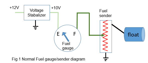 The fuel gauge in an MGB is very basic, consisting of a float connected to a variable resistor (sender unit) One end of the resistor is connected to ground, the other end is connected to one side of the gauge. The other side of the gauge is connected to the voltage stabilizer. (fig1)The gauge consists of a heater coil and bi-metallic strip with a pointer attached. When the ignition switch is turned on, current flows causes the heater coil to heat and the bi-metallic strip to deflect and pointer to move, indicating the fuel reading on the gauge. (The reason the gauge is slow to response) Moving the float up or down changes the resistance, causing a respective change in current through the heater coil and the amount the bi-metallic strip/pointer deflects.