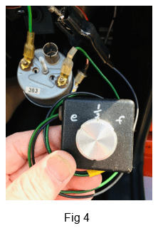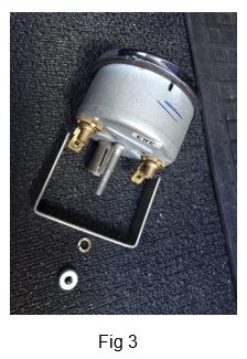 To remove the gauge, first put your hand under the dash and undo the small knurled nut on the back of the gauge, remove the washer, earth lead and U shaped bracket. (See fig 3). The black earth wire is only for the gauge lighting but is a handy ground connection for one end of the resistor.