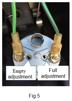 With the gauge removed Looking at the rear you will see two holes with small screw driver slots. See fig 5) These are the adjusters for setting the E and F calibration points.