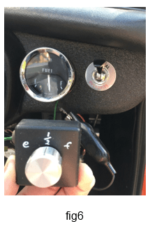 Turn on the ignition and allow the gauge to read. Remember the gauge is slow to respond so allow 20 – 30 seconds between any adjustments. With the 222 Ω resistor, the gauge should read E but in my case was reading ¼ full. So bearing in mind the above I opted for the ½ and ½ approach. Using a small screwdriver I turned the Empty adjuster to position the needle so it now showed half way between ¼.and E.(Half the original reading) Replacing the resistor with the 20 Ω value to represent a F (full tank). (This is where my little switch box made this easier) allowing 20-30 seconds for it to stabilize my gauge now read just over ¾ full. So with my screw driver in the FULL adjustment hole adjusted the needle to read half way between the original reading and F. Then replacing the resistor again with the empty value (222 Ω) allowed for the needle to stabilze at the zero end. Again making an adjustment to half the error then repeating with Full resistor value. Repeat this until the gauge gives the correct readings at Full and Empty with one final check at ½ full. My gauge seems to have some hysteresis as when going from F to ½ the gauge read exactly ½ (see fig 6), but when going from E to ½ it read just under the ½ mark. In all this took me around 30 mins.