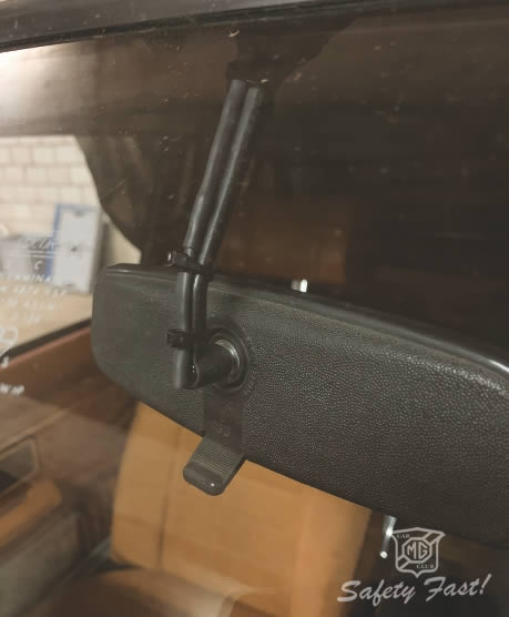 I bought a 4-19V dimmable LED (4’000 mcd, more would have been better!) from a DIY shop and soft-soldered two thin wires to its legs, one wire clipped to the red-white +12V panel illumination cable, the other wire connected to frame GND (e.g. somewhere at the A-post, behind the vinyl A-post cover). The two legs of the LED must of course be separately insulated by using heat shrink tubing. This method is also useful to protect and cover the whole LED assembly in order to prevent light scatter in the direction of the windscreen, etc. It’s now an easy job to fix the LED assembly to the stem of the interior mirror by using some small cable ties (see photo). Wires can, in an MGB GT, easily be hidden by routing them behind the front header rail, down along the A-post (behind the cover) and then, behind the dashboard, to be directly connected to the red-white +12V panel illumination cable and to GND (without any electronic dingdongs!). The installation of a fuse (max. 500 mA) between the +12V wire to the LED and the original red-white +12V panel illumination cable is strongly recommended.