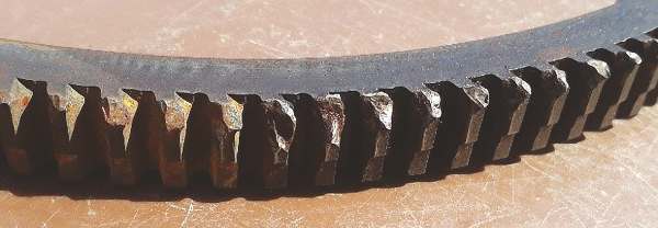 Once the engine was out of the car the problem was obvious. The starter ring was very badly mauled in a couple of places (see photo). The ring is an interference fit on the flywheel, so either has to be heated to a temperature far higher than I could achieve at home or drilled through the ring to weaken the ring before ‘breaking’ it with a Hammer and cold chisel. This it did and I then